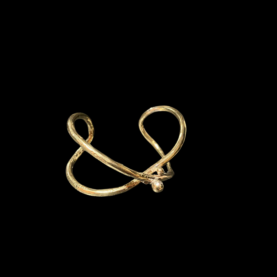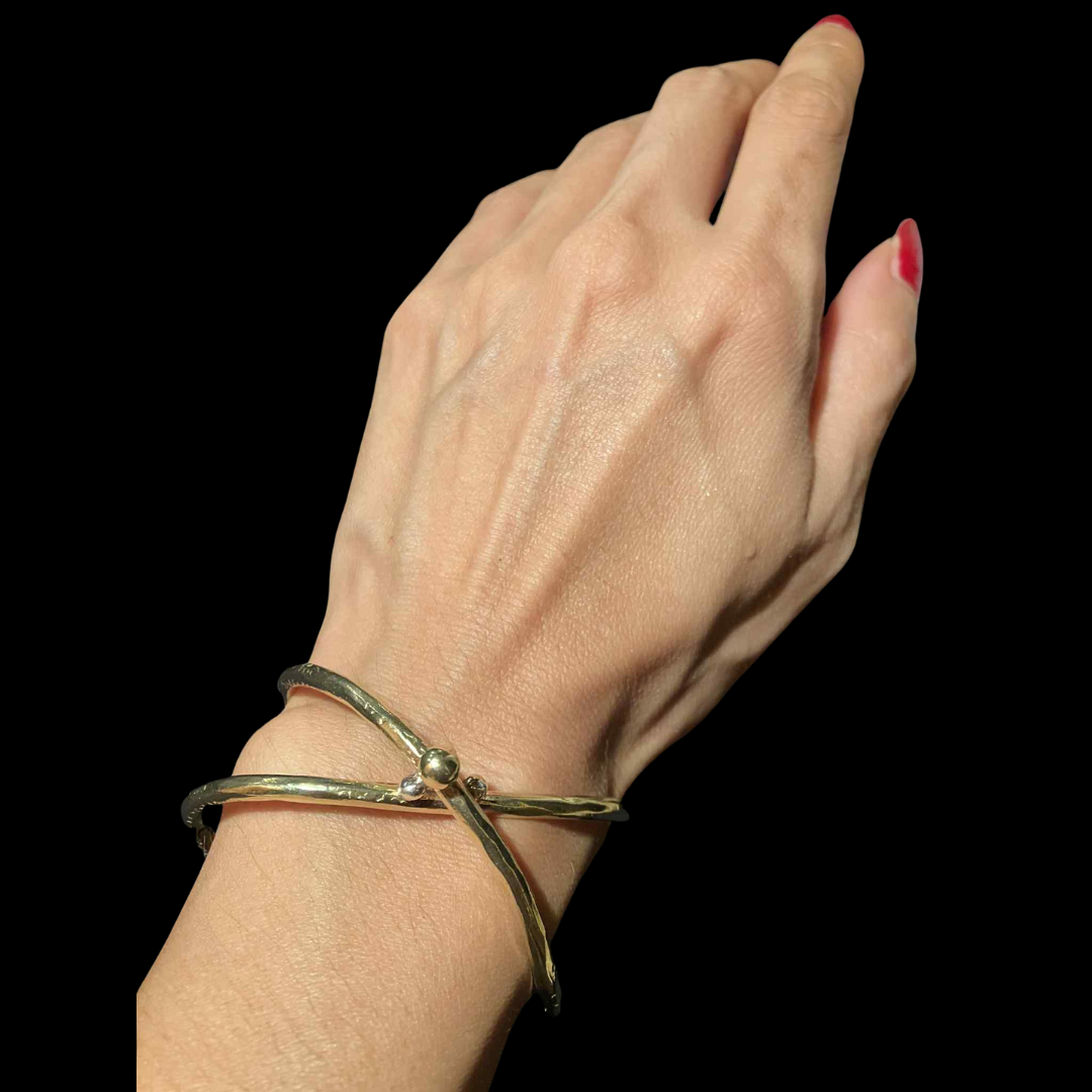 A handcrafted brass bangle with crossing lines that meet at a polished sphere, shining with a silver-like glow.