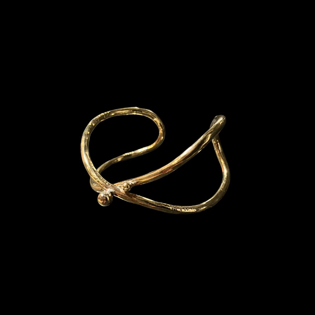 The Cross Point Bangle brings two flowing bands together at a single focal point. At the center rests a polished brass sphere, crafted to shine with the brightness of silver while retaining the warmth of brass. The result is a bold yet refined design that highlights both contrast and balance on the wrist.