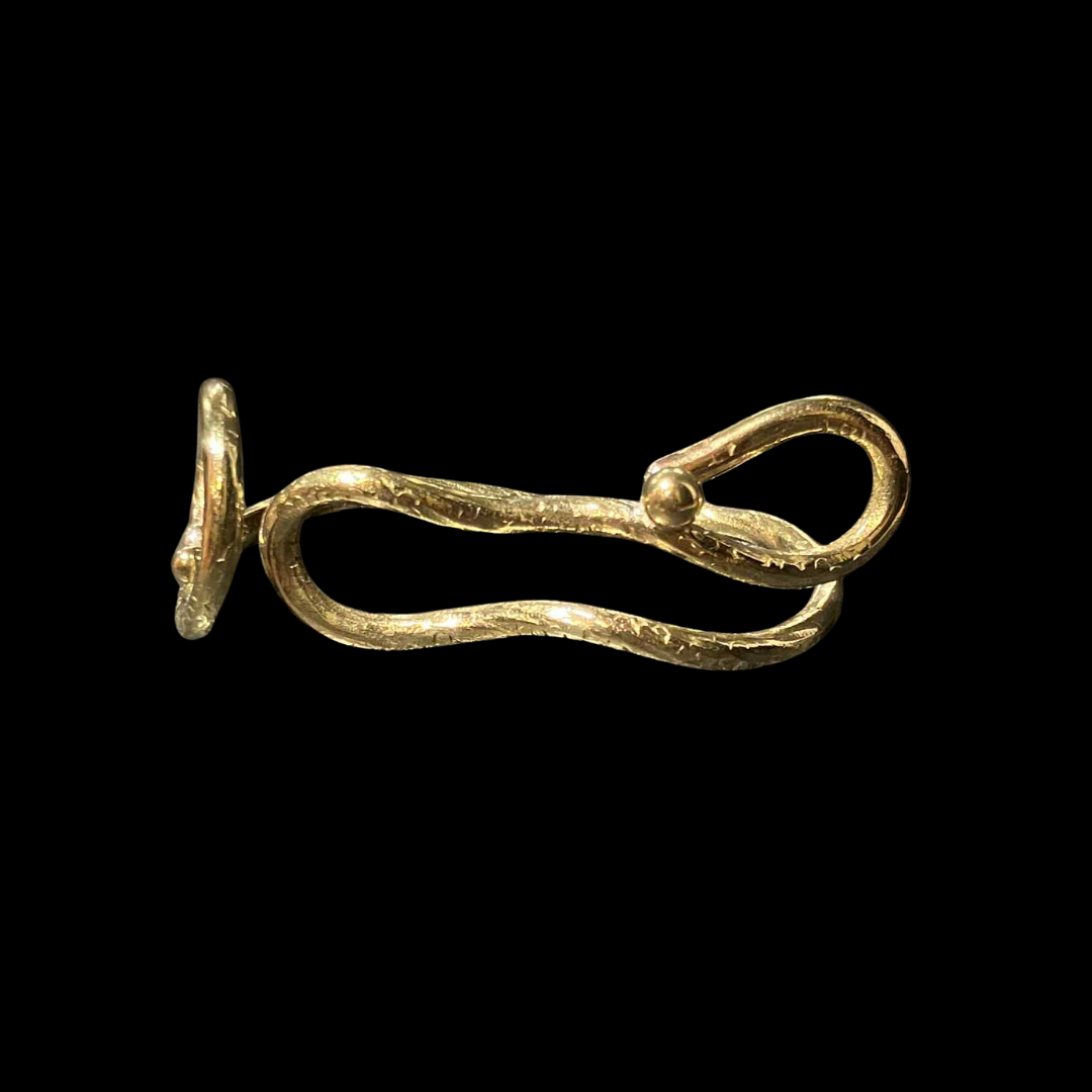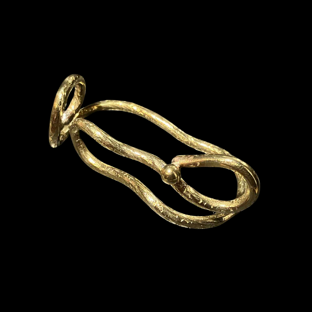 The Serpent Coil Ring stretches gracefully across three fingers, its flowing lines curling like a serpent in motion. Handcrafted in brass, the textured curves wrap with strength and elegance, ending in a polished sphere that completes the design. A statement piece that embodies both fluidity and power.